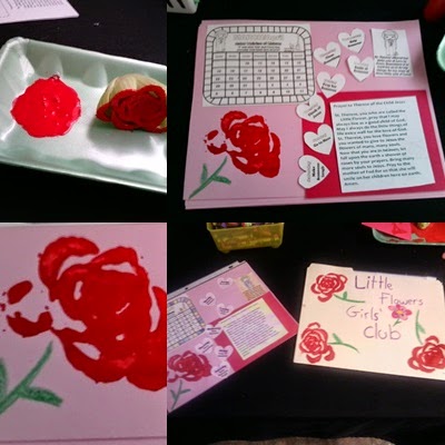 We used a celery base and paint to make roses on paper and our folders and they came out so pretty! We also made a St. Therese page using print outs from google images and the St, Therese prayer art that I made. It worked out so well and the girls all had so much fun doing it.
